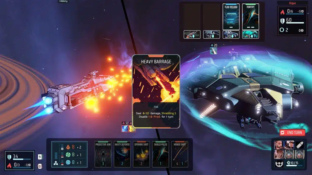 En plus des armes, le joueur dispose d’autres systèmes tels que les boucliers et le piratage. Les cartes bouclier peuvent être jouées pour vous donner une certaine défense, et les cartes piratage peuvent être utilisées pour influencer le deck de votre adversaire, ce qui vous permet de retirer une carte puissante du jeu.